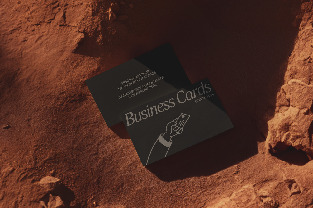 photoshop mockup template for 2 business cards (350*200mm) lying in an atmospheric red sand, desert landscape. You can use this mockup in any personal or commercial project to enhance your design presentations and add a rough, natural touch.