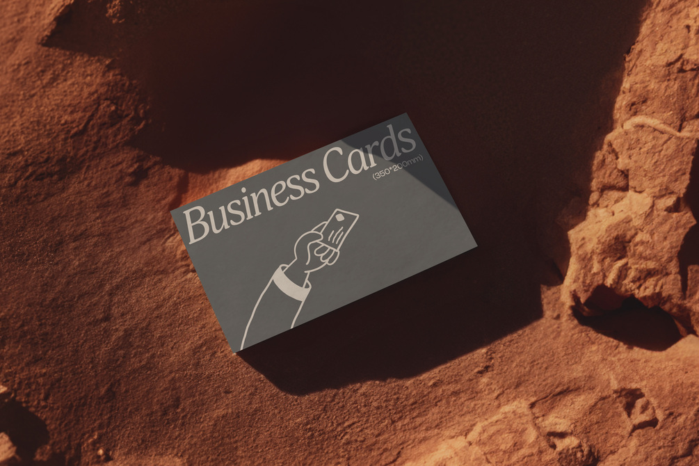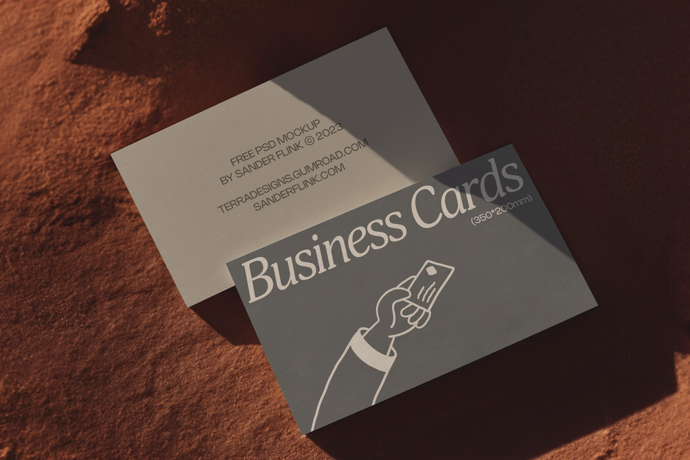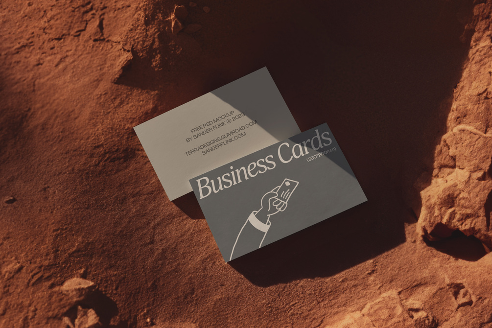 photoshop mockup template for 2 business cards (350*200mm) lying in an atmospheric red sand, desert landscape. You can use this mockup in any personal or commercial project to enhance your design presentations and add a rough, natural touch.